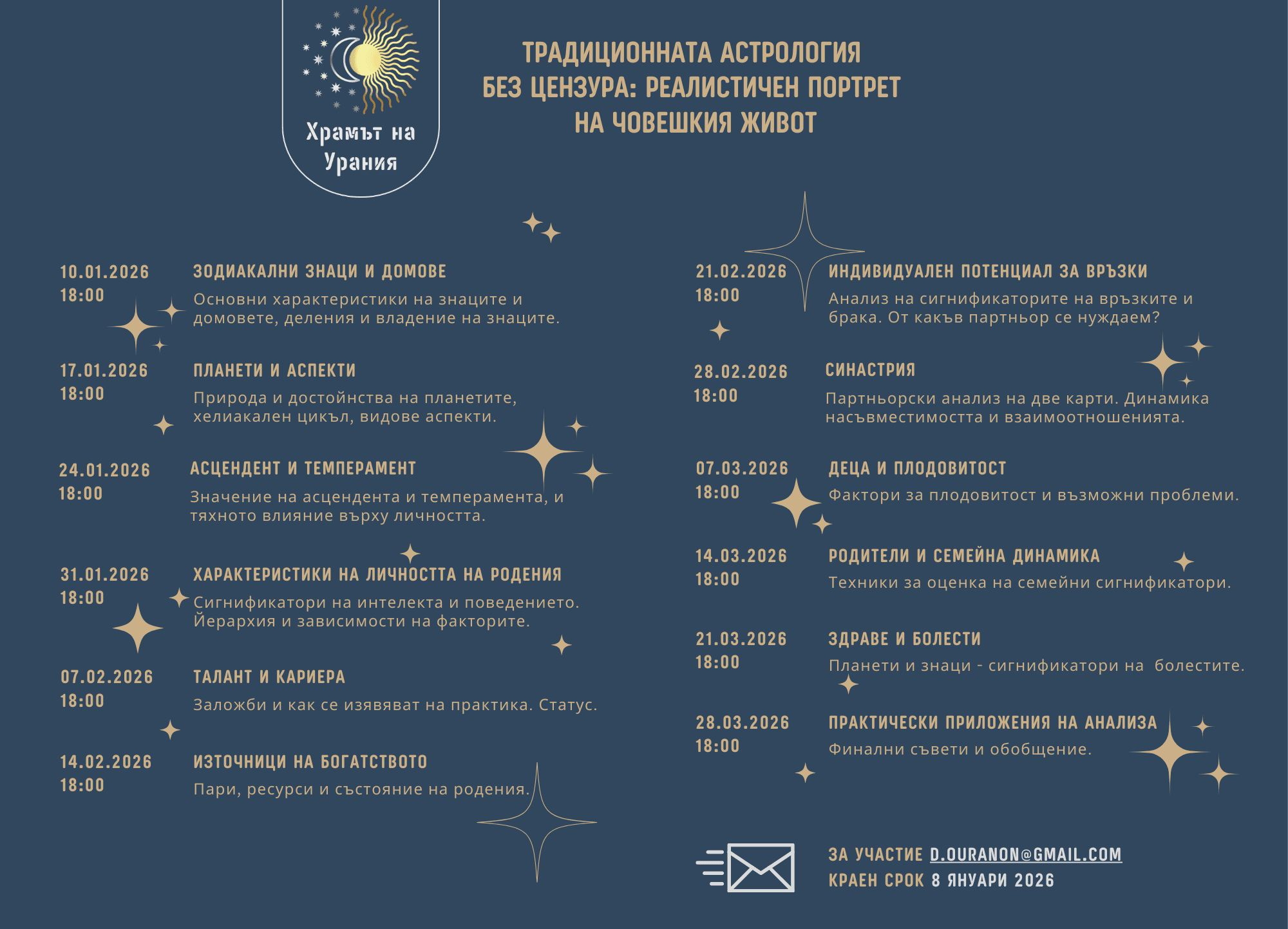 💻 Формат: Онлайн през Zoom - 12 занятия по 3 астрономически часа, всяка събота вечер в 18:00 ч.